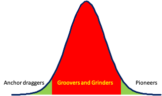 In a ‘normal’ distribution of people, be they leaders or workforce in general, I find that people are in any of the four areas described. There will some Pioneers, there will be Anchor draggers. The majority of people however will be in the middle, but most of them will be Grinders and a few of this middle group will be Groovers.